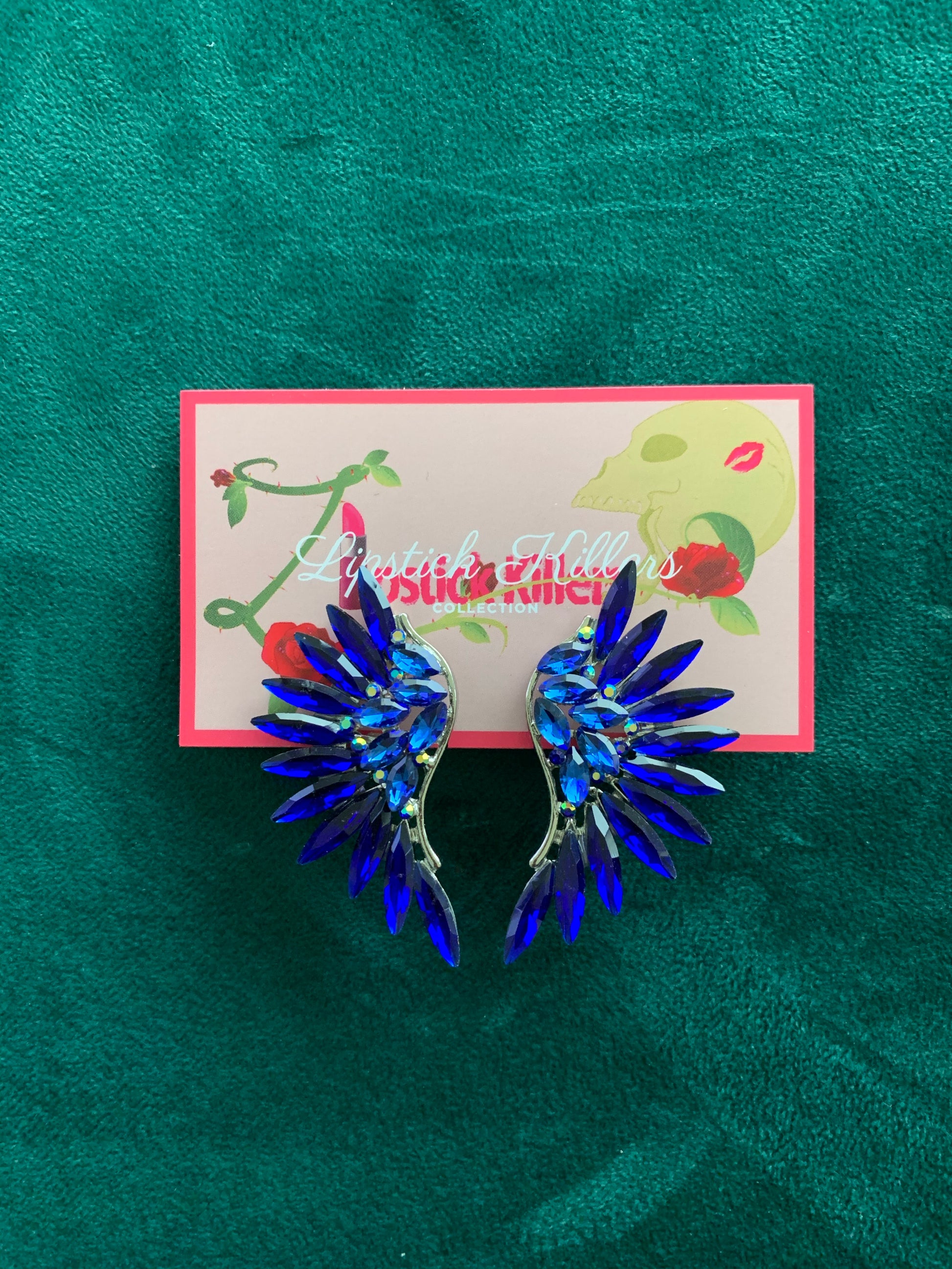 - Pair our royal blue angel wings earrings with a sleek leather jacket and distressed jeans for an edgy, rocker-inspired look