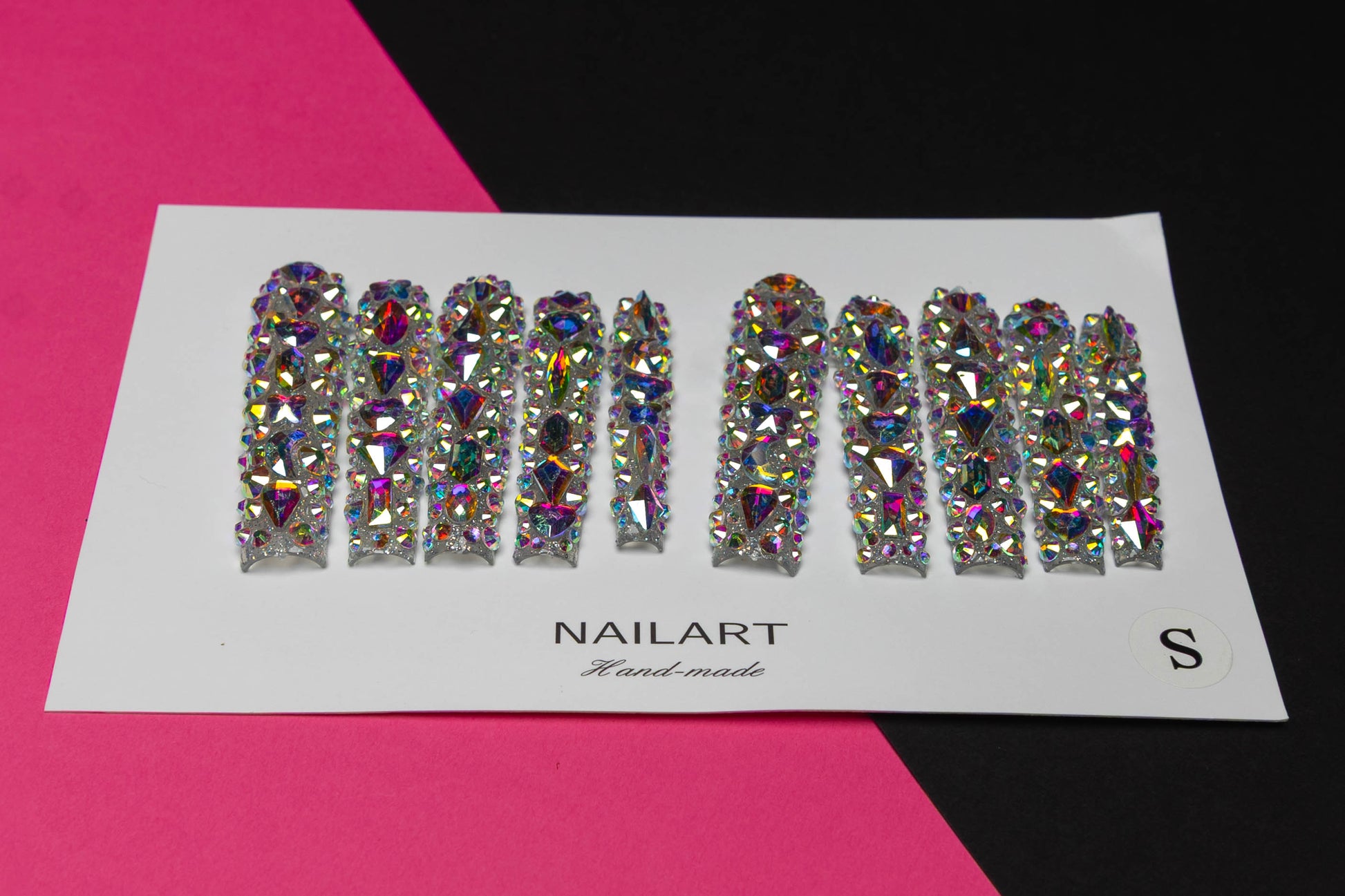 Extra long fully covered stone nails. Translucent color glitters in all forms of light.