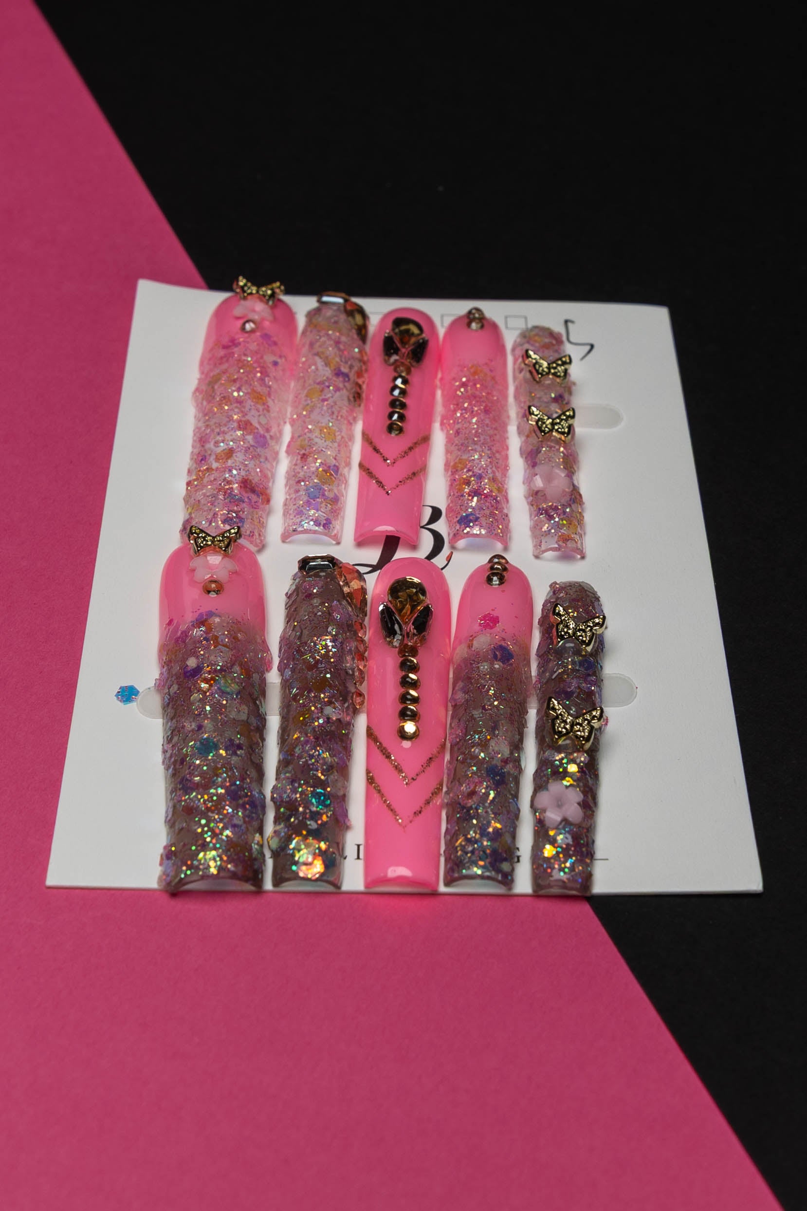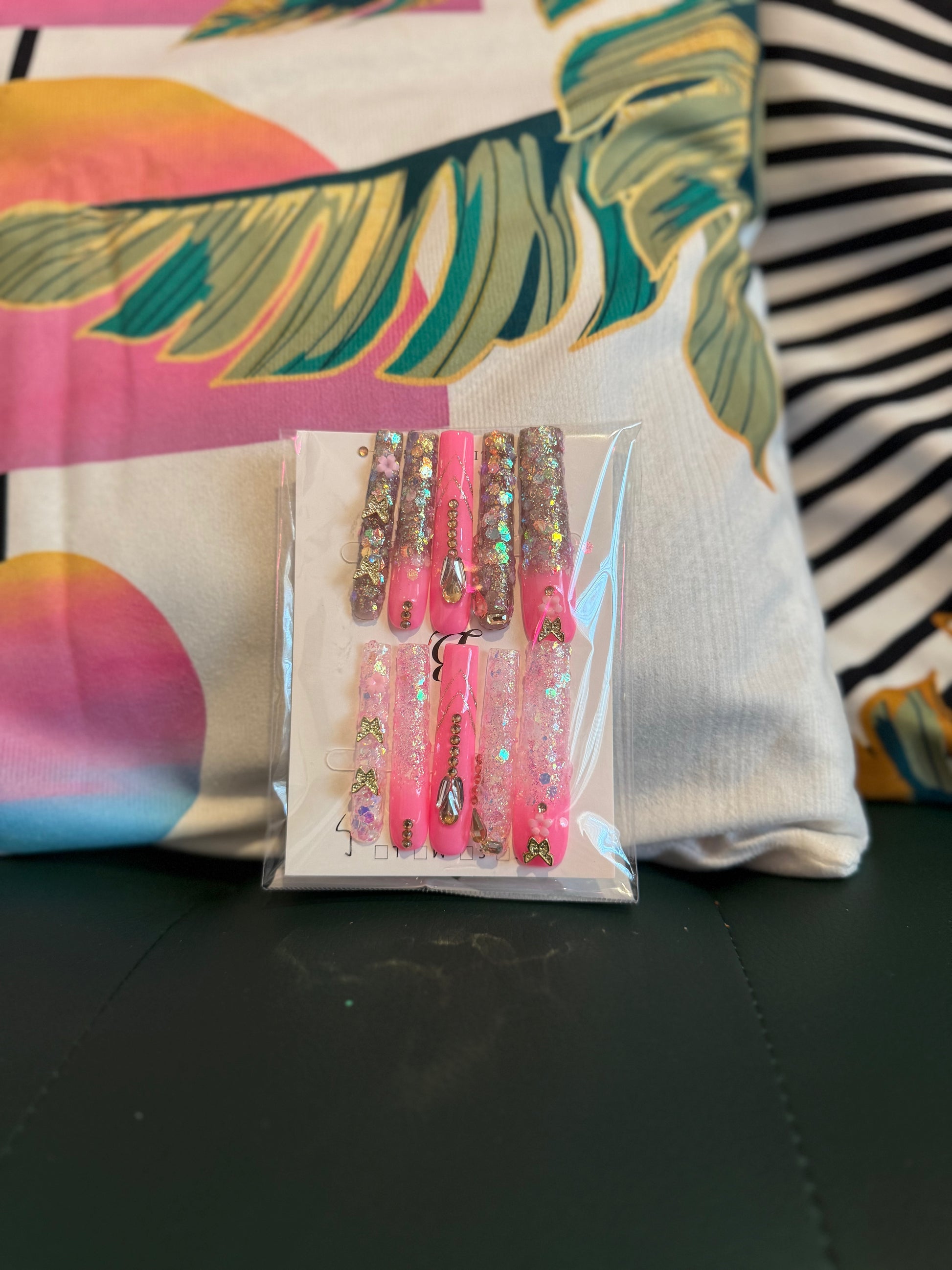 Extra long hot pink nail set with gold plated charms and stones. Size small.