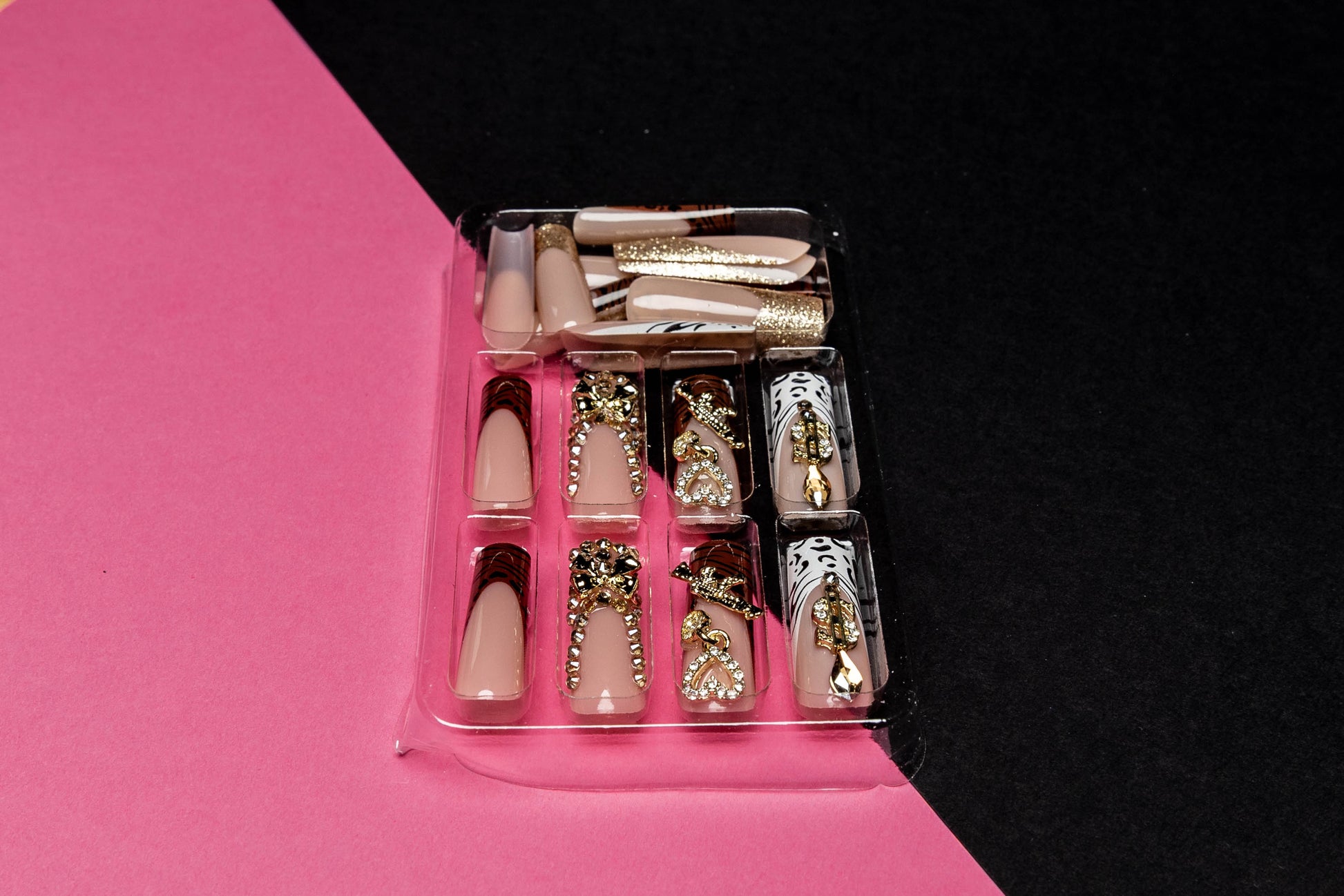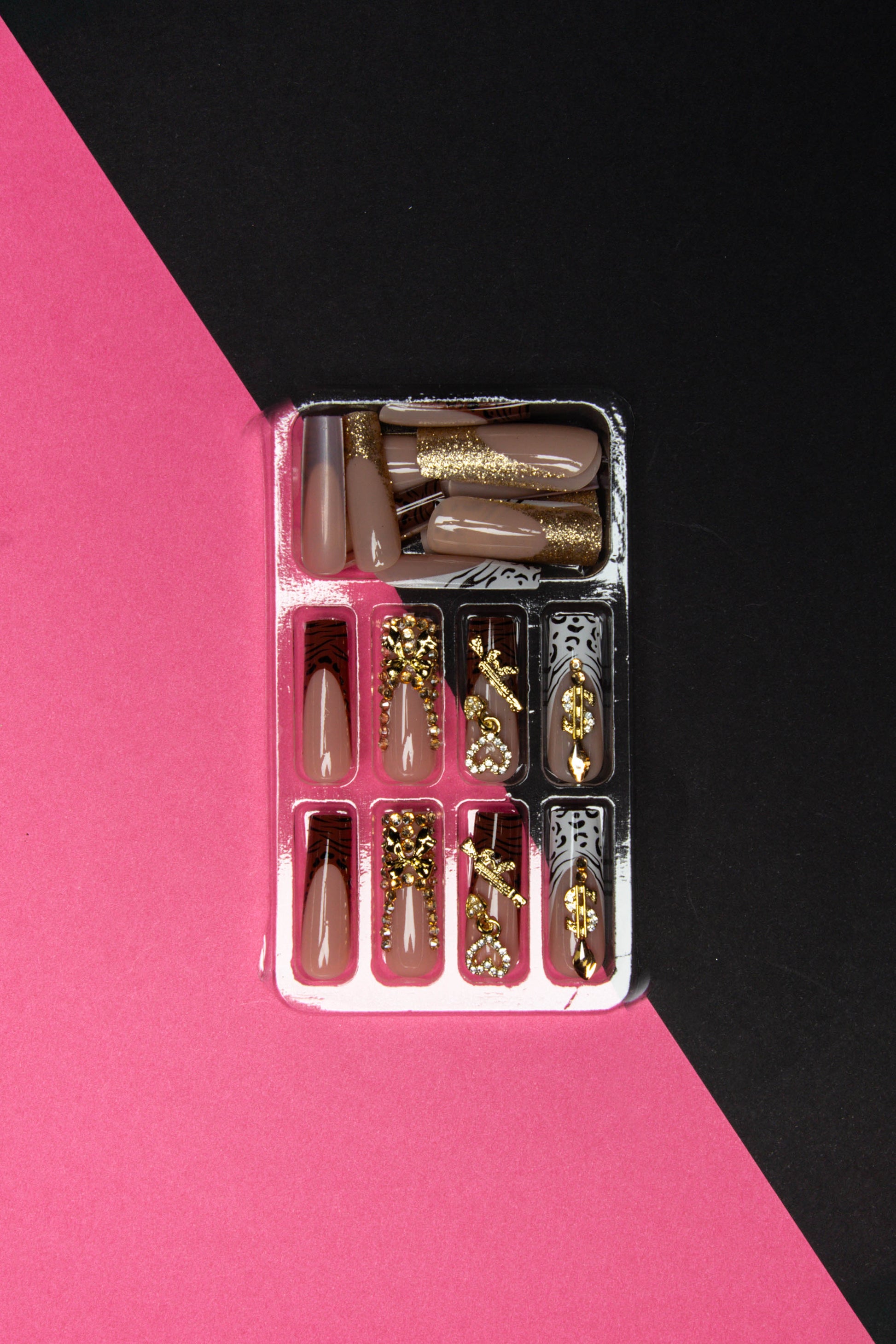 24pcs nail set with zebra burgundy and white/black leopard designs. Gun, money, bows, and stone gold plated charms.