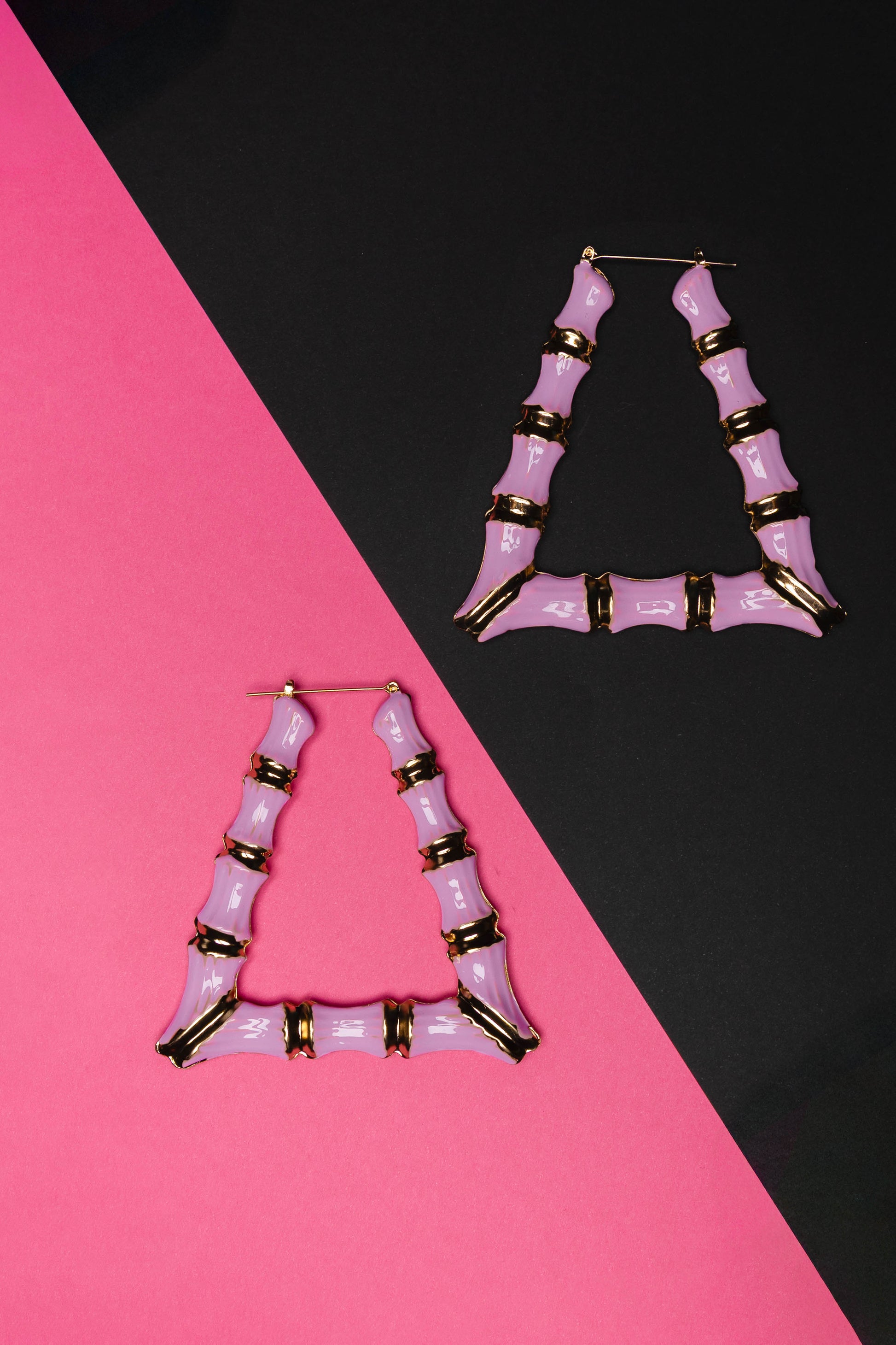 Gold Metal and Lavender Pink Epoxy Hollow Trapezoid Bamboo Hoop Earrings. Earrings measure 3.5 inches