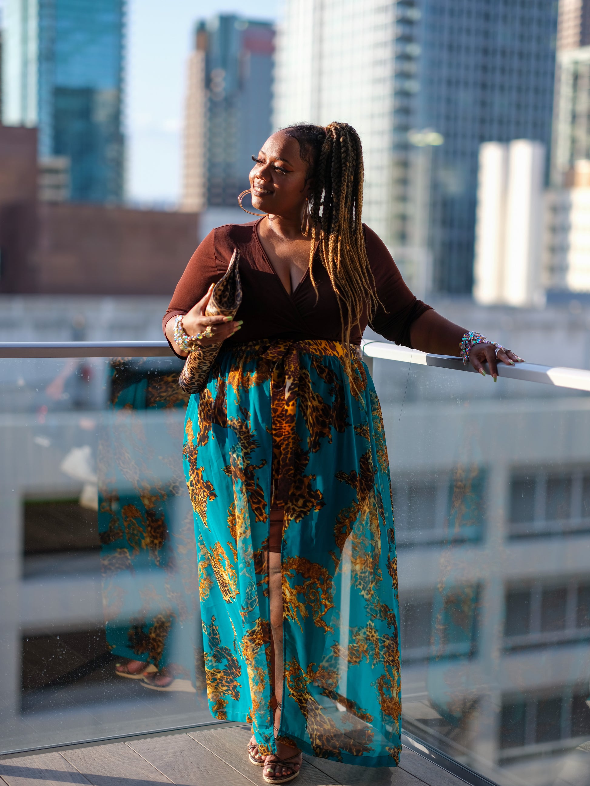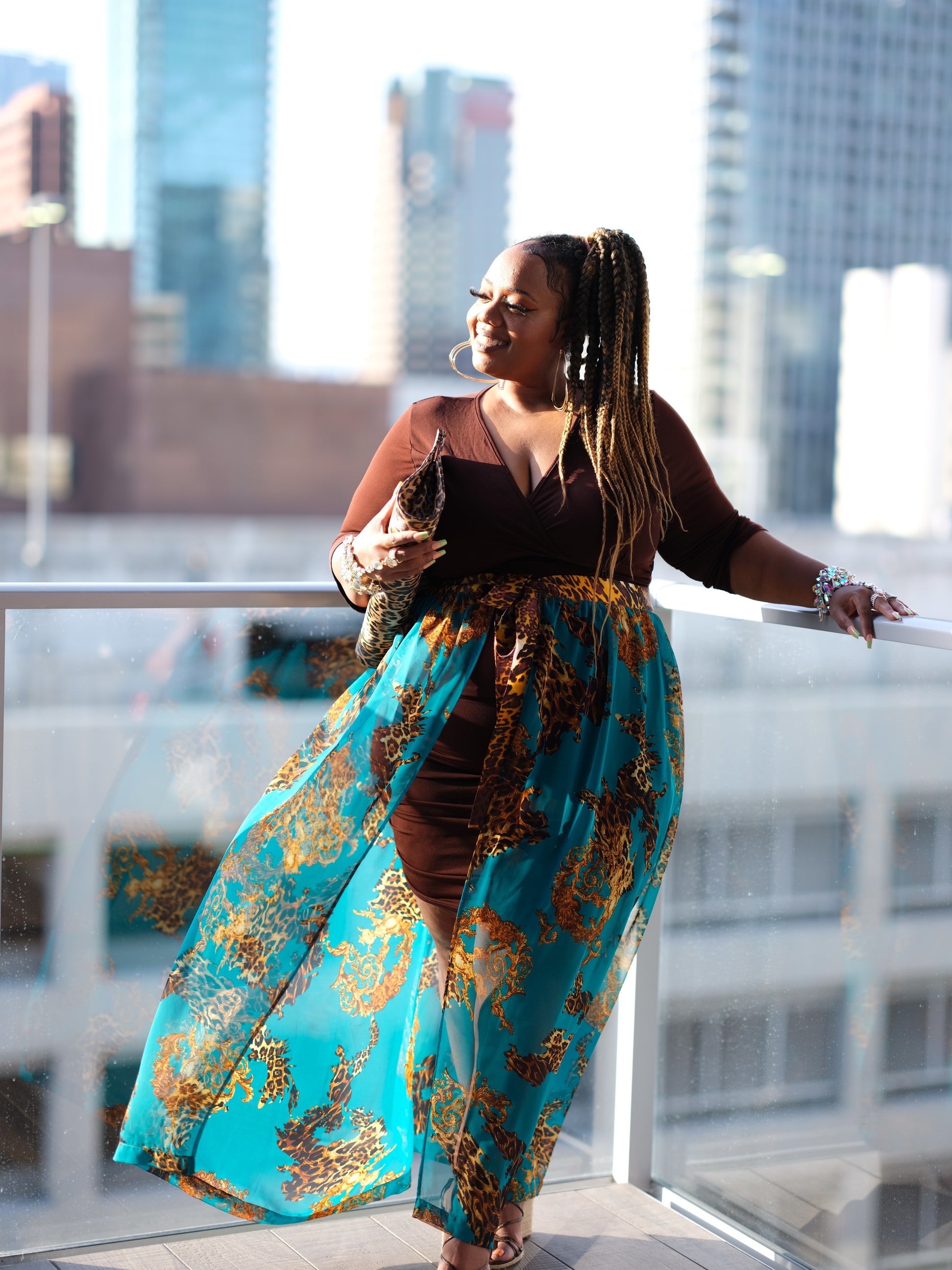 This one size fits most (M - 2X) Teal Sheer Print Tail is to die for ⚰️🐆⚰️🐆 paired with a ruche pencil dress seen in pic or rock it with some denim and a tank. It’s a one of a kind, at home glamour staple piece ☺️